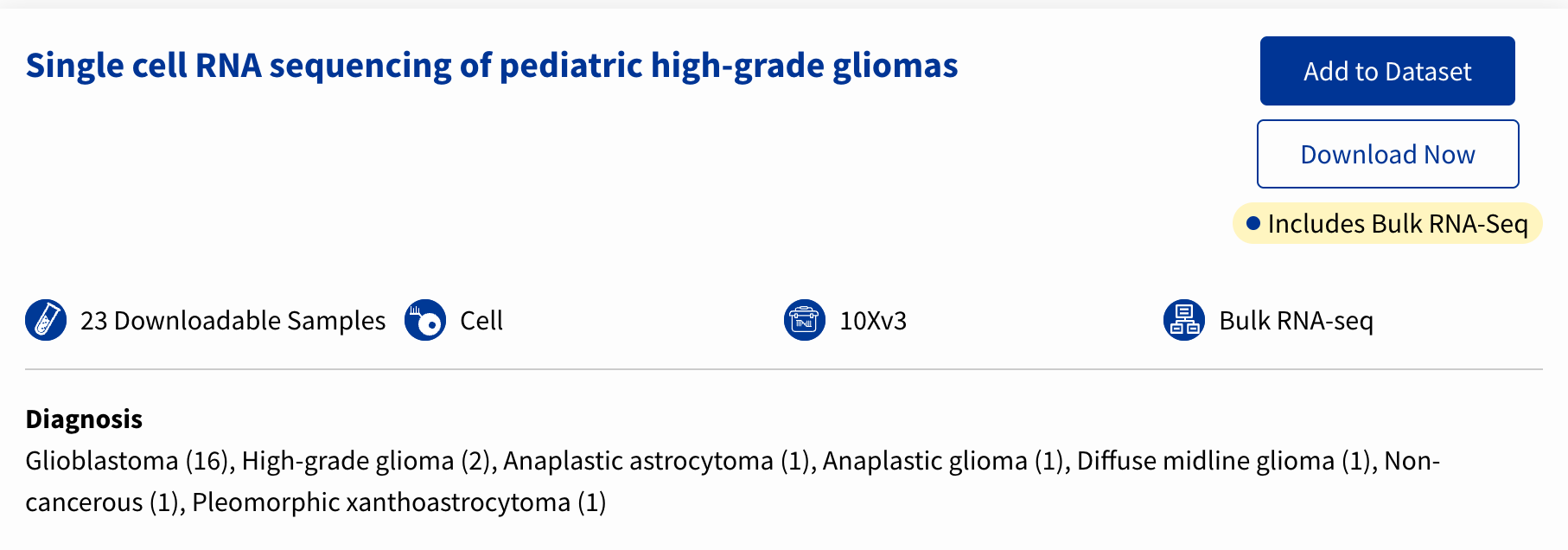 Now, when you explore an ScPCA project, you’ll see a button that says [.inline-snippet]Add to Dataset[.inline-snippet], which you can select to begin adding that project to your “cart.”