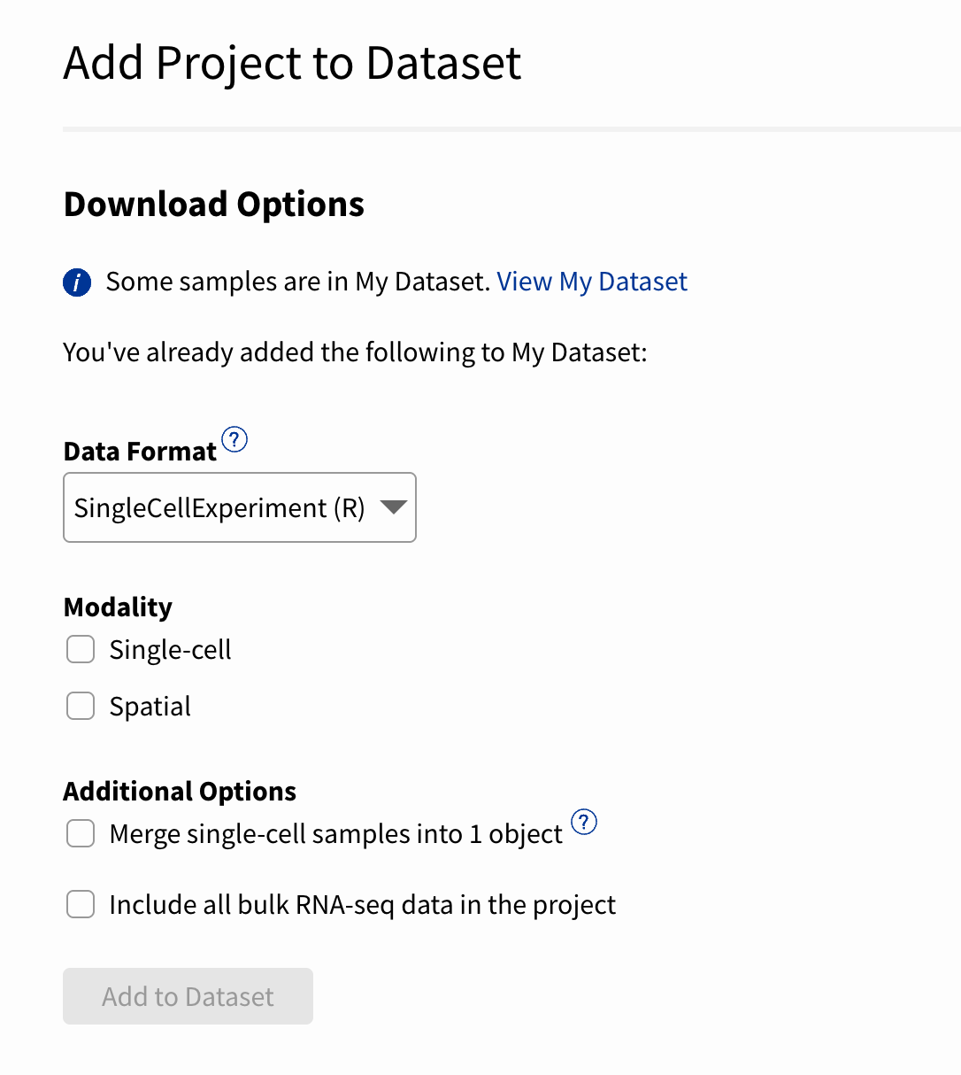 You can then select the data format and any additional modalities (e.g., spatial and bulk) available for the samples in your custom dataset.