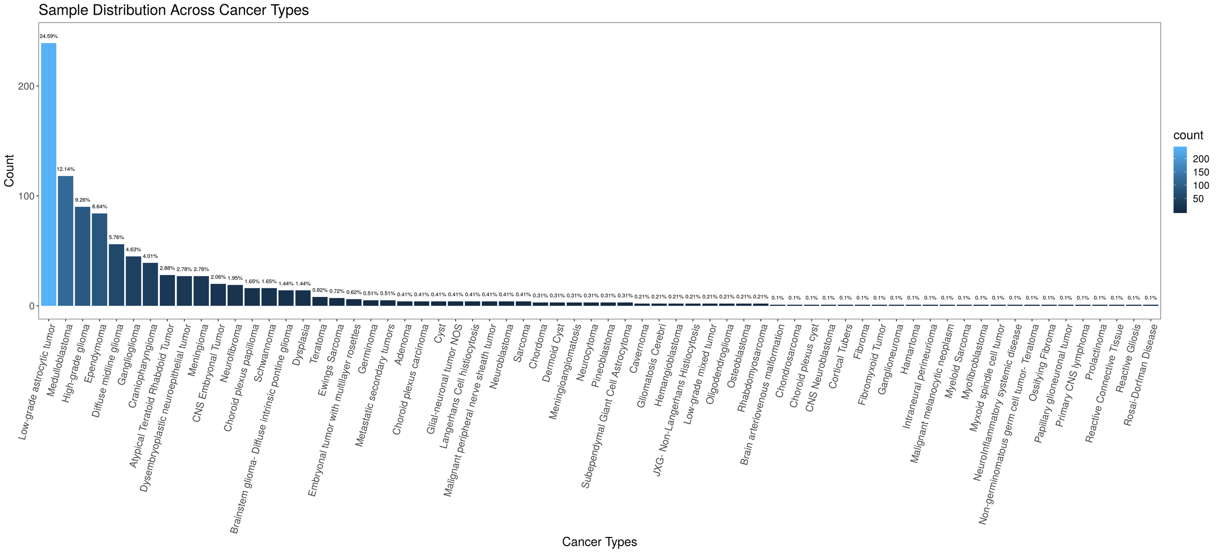 The OpenPBTA dataset is an excellent resource with over 30 different disease types represented. A mix of disease types can pose an analytical challenge, especially considering some groups are composed of very few samples; others have hundreds of samples.